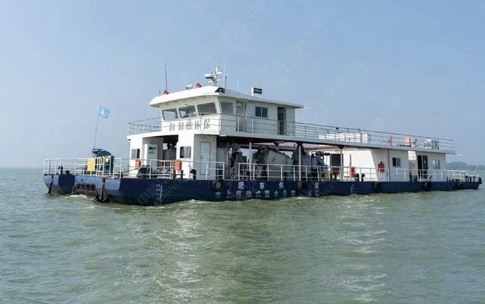 藻水高效氣浮分離船基本原理為“絮凝+氣浮”,即通過投加絮凝劑,使藍藻快速形成絮體礬花,再由溶氣系統產生大量微納米級氣泡,與藍藻絮體等懸浮物黏附在一起上浮水面,從而實現藻、水分離。氣浮船配備兩只智能遙控船從左右兩側牽引圍隔“圍、追、堵、截”,聚集約500平米水域藍藻水華,并將富集藻用軟管泵吸輸入氣浮裝備,經過快速絮凝、高效分離、藻泥壓濾,清澈的尾水源源不斷注入湖體。