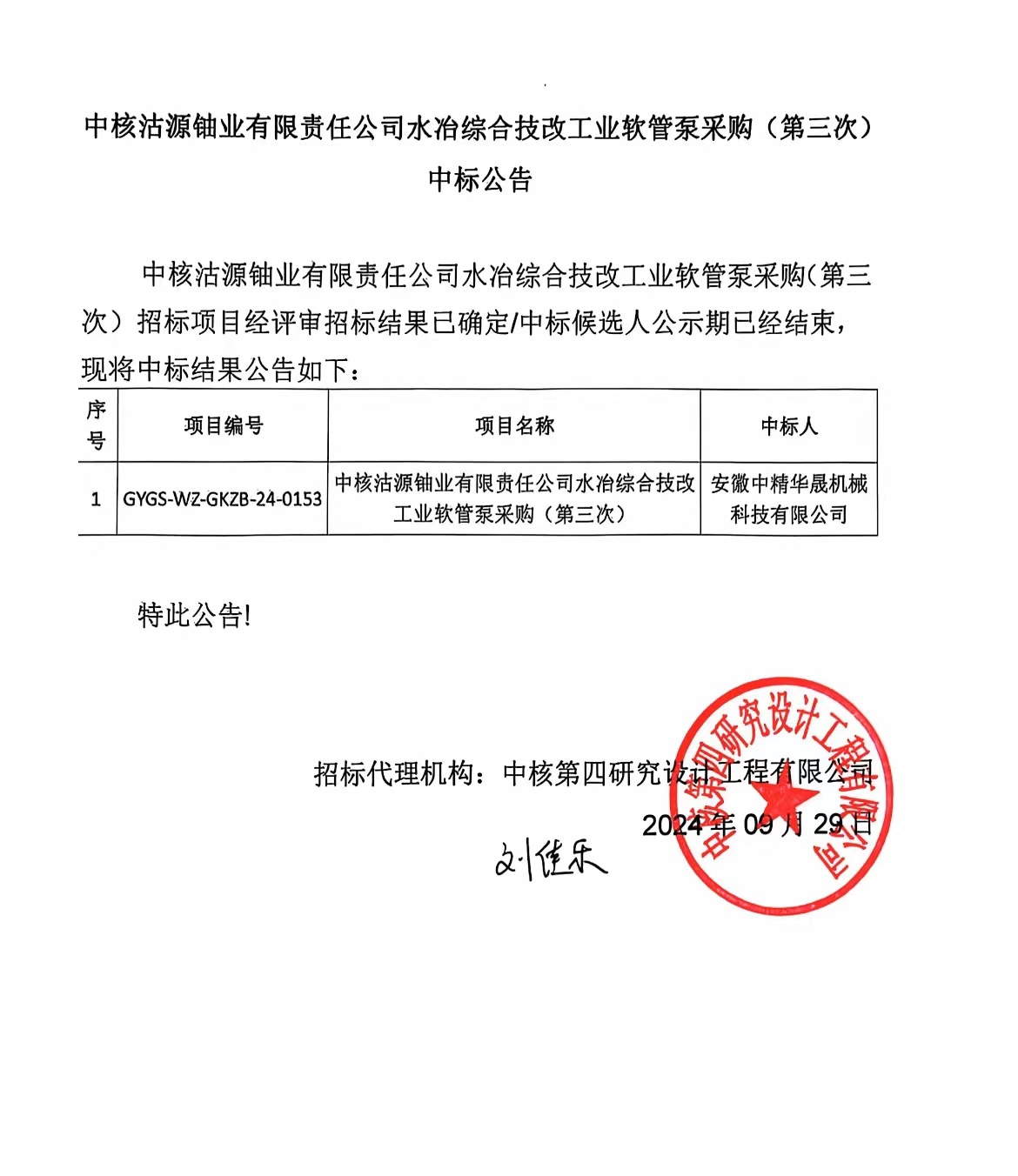 大家好!非常高興地向大家宣布,我司于2024年9月29日成功中標(biāo)了中核沽源鈾業(yè)有限責(zé)任公司水冶綜合技改工業(yè)軟管泵采購(gòu)(第三次)項(xiàng)目。首先,我要向所有參與項(xiàng)目投標(biāo)的同事們表示熱烈的祝賀和衷心的感謝,是你們的辛勤付出、智慧和團(tuán)結(jié)精神,才使我們?cè)诩ち业母?jìng)爭(zhēng)中脫穎而出,成功中標(biāo)了這個(gè)重要項(xiàng)目。對(duì)于我司的發(fā)展具有重要的意義。中標(biāo)該項(xiàng)目不僅能夠增強(qiáng)我司在市場(chǎng)的競(jìng)爭(zhēng)力,提升品牌形象,而且能夠帶動(dòng)相關(guān)產(chǎn)業(yè)的發(fā)展促進(jìn)整個(gè)行業(yè)的進(jìn)步。